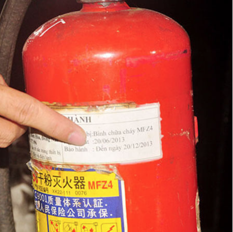 Bình chữa cháy được trang bị và chưa sử dụng nhưng đã hết thời hạn bảo hành.