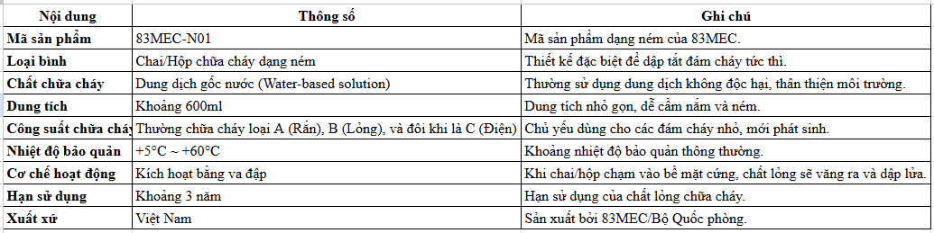 Thông Số Kỹ Thuật Của Bình Cứu Hỏa 83MEC - BQP Dạng Ném