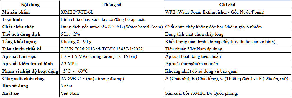 Thông Số Kỹ Thuật Của Bình Cứu Hỏa Gốc Nước 83MEC - BQP 6 Lít