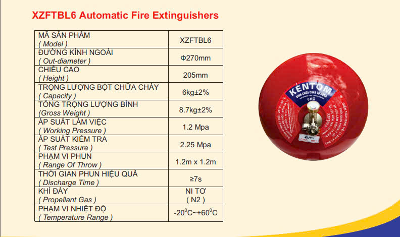 Thông số: Bình Cầu Chữa Cháy Tự Động XZFTBL6 Bột ABC 6kg Kentom Có Kiểm Định