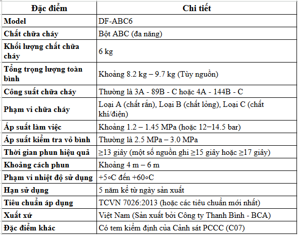 Thông Số Kỹ Thuật Của Bình Cứu Hỏa Bột ABC 6Kg Defire DF-ABC6