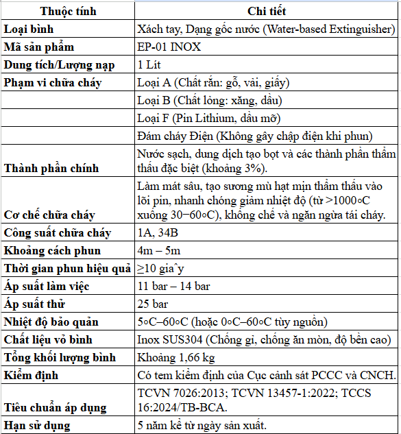 Thông Số Kỹ Thuật Của Bình Cứu Hỏa Elephant 114 Pin Xe Điện 1 Lít Vỏ INOX EP-01