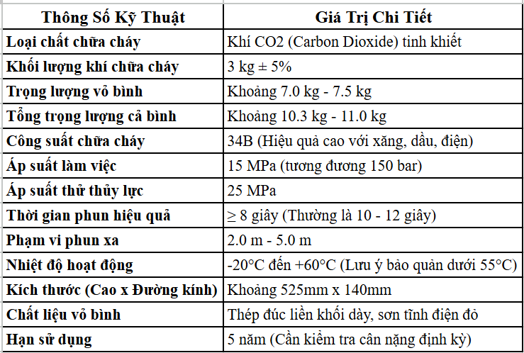 Thông Số Chi Tiết Của Bình Cứu Hỏa Khí CO2 3kg MT3 Miha