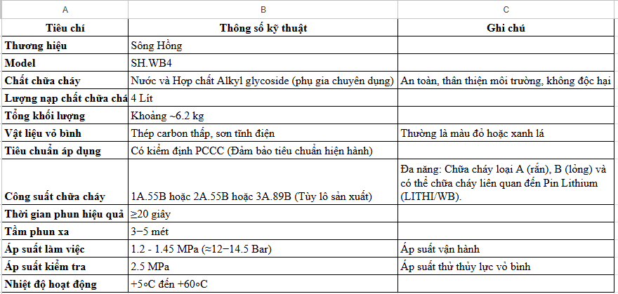 Thông Số Kỹ Thuật Của Bình Cứu Hỏa Đa Năng Gốc Nước 4 Lít Sông Hồng SH.WB4