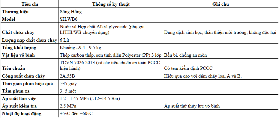 Thông Số Kỹ Thuật Của Bình Cứu Hỏa Đa Năng Gốc Nước 6 Lít Sông Hồng SH.WB6