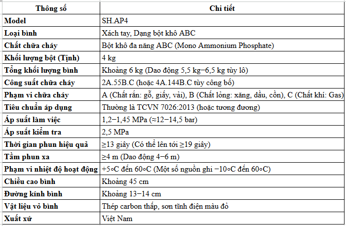 Thông Số Kỹ Thuật Của Bình Cứu Hỏa Sông Hồng Bột ABC 4Kg SH.AP4