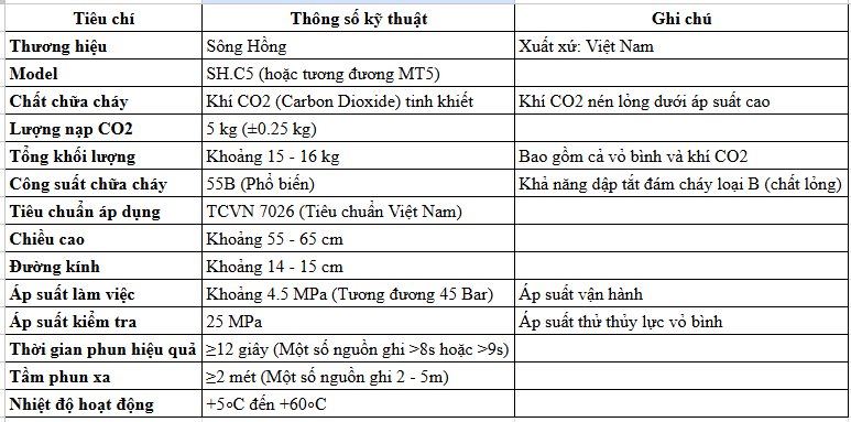 Thông Số Kỹ Thuật Của Bình Cứu Hỏa Sông Hồng Khí CO2 5Kg SH.C5