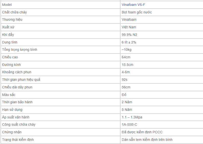 Thông Số Kỹ Thuật Của Bình Chữa Cháy Bọt Foam 6 Lít VF6 Vinafoam