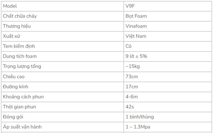 Thông Số Kỹ Thuật Của Bình Chữa Cháy Bọt Foam 9 Lít VF9 Vinafoam