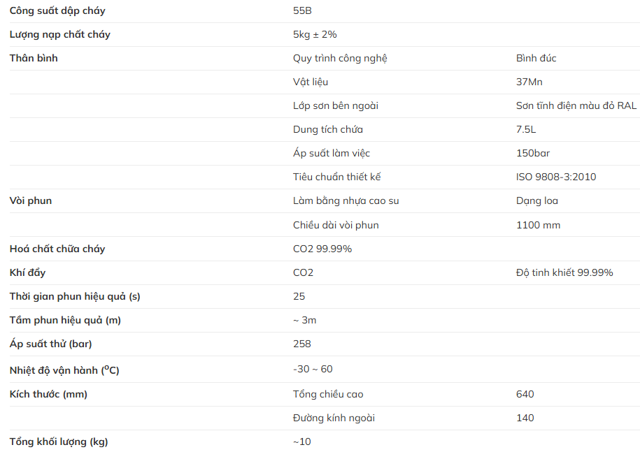 Thông Số Kỹ Thuật Của Bình Chữa Cháy Khí CO2 5Kg Vinafoam CMC5