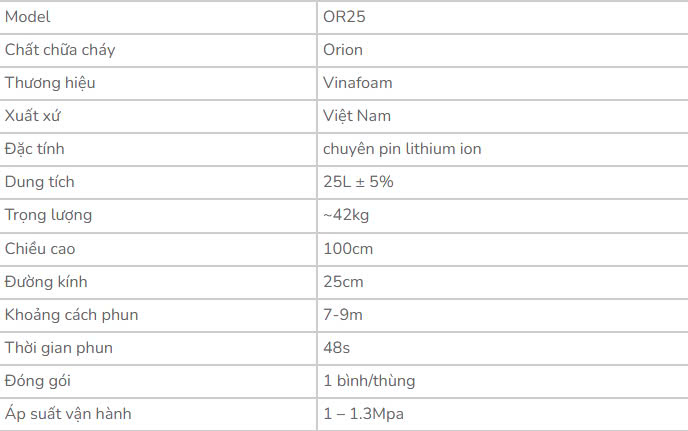 Thông Số Kỹ Thuật Của Bình Chữa Cháy Xe Đẩy Điện Pin Lithium ORION 25L OR-25 Vinafoam