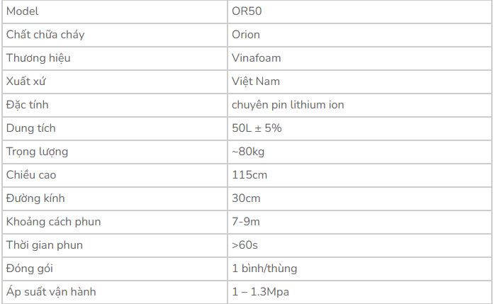 Thông Số Kỹ Thuật Của Bình Chữa Cháy Xe Đẩy Điện Pin Lithium ORION 50L OR-50 Vinafoam