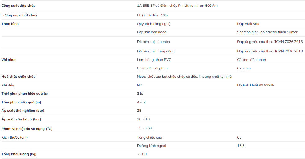Thông Số Kỹ Thuật Của Bình Chữa Cháy Xe Điện Pin Lithium ORION 6L OR-6 Vinafoam