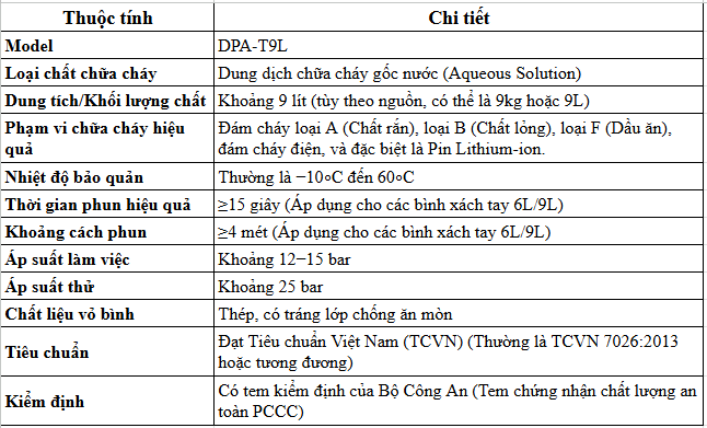 Thông Số Kỹ Thuật Của Bình Cứu Hỏa Đa Năng Gốc Nước 9 Lít Dolphin DPA-T9L