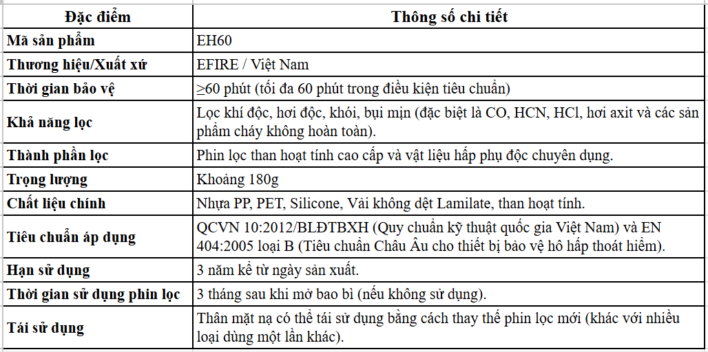 Thông Số Chi Tiết Của Mặt Nạ Phòng Khói Khẩn Cấp EFIRE EH60
