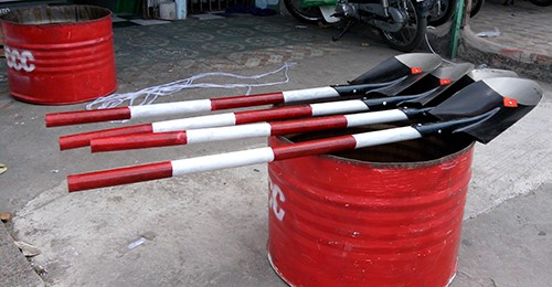 Xẻng xúc cát PCCC dùng chung với thùng phuy đựng cát chữa cháy