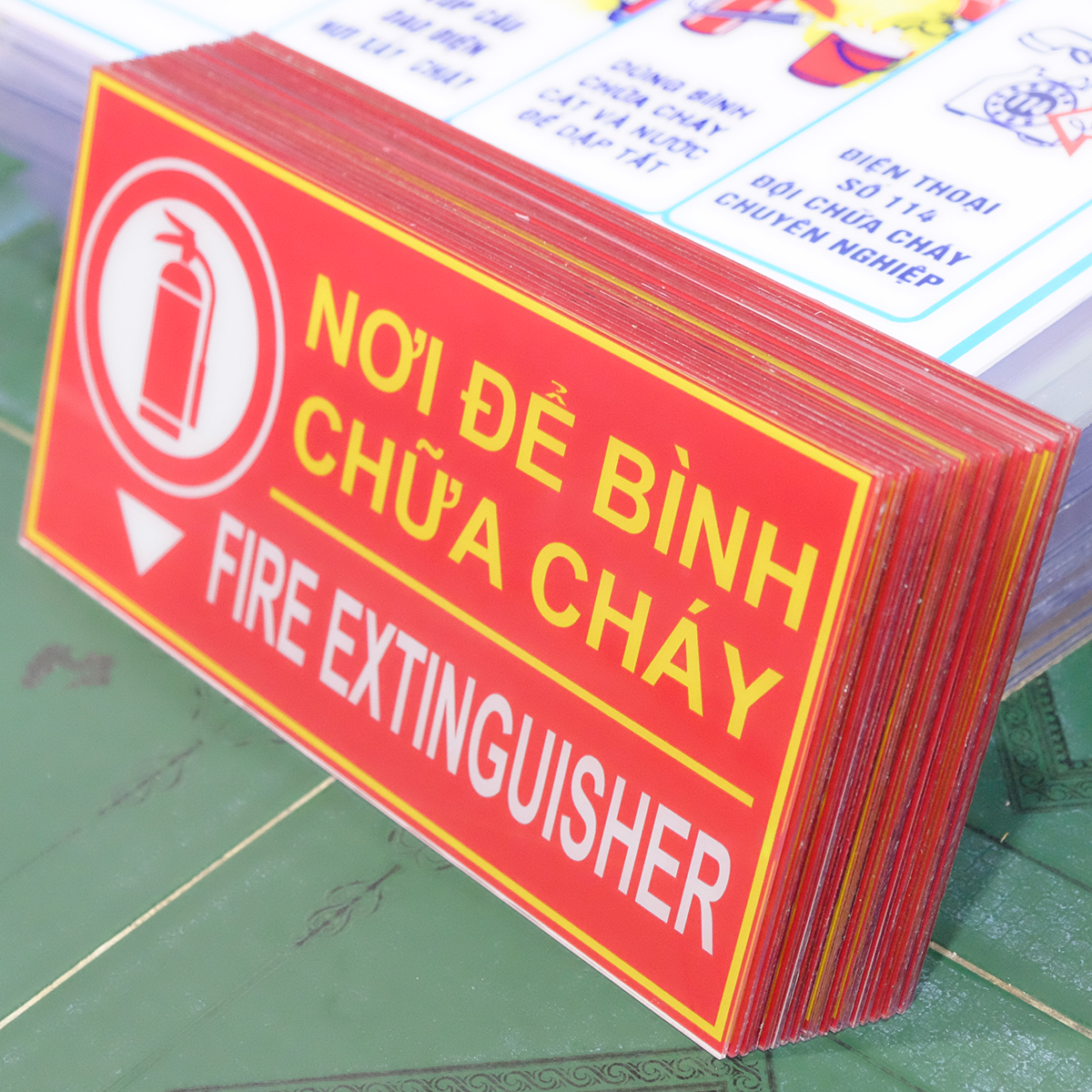 Bảng nơi để bình chữa cháy là một bảng chỉ dẫn được gia công bằng nhựa mica trong, phía sau dán decal một cách tỉ mỉ đảm bảo độ bền và đẹp cho sản phẩm. Với hình ảnh một bình chữa cháy bên trong thiết kế giúp dễ dàng nhận biết, thậm chí có thể đoán ra mà chưa cần đọc nội dung. Nội dung bao gồm màu trắng và vàng được đặt trên nền màu đỏ tạo sự thu hút với thị giác một cách hiệu quả.