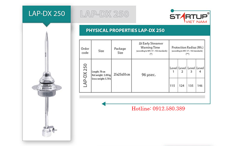 Thông số kim thu sét LIVA LAP-DX 250