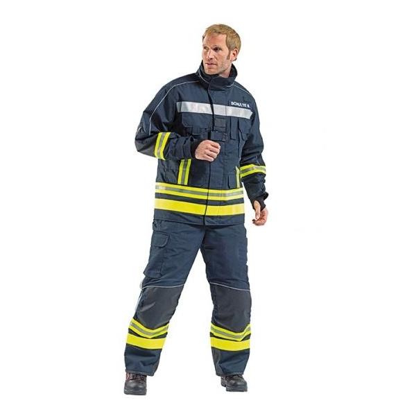 - Quần chống cháy: Có 2 túi hộp bên hông quần, có viền phát quang rộng 5cm. Quần còn có phần lưng quần nhô cao 10cm, được gắn với hai dây đeo vai.