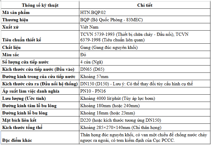 Thông Số Kỹ Thuật Của Họng Tiếp Nước Cứu Hỏa 4 Cửa Bộ Quốc Phòng
