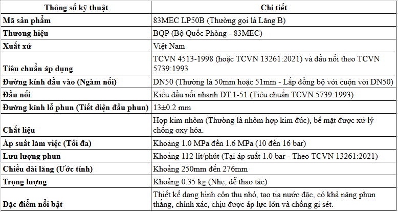 Thông Số Kỹ Thuật Của Lăng Phun Cứu Hỏa D50 Bộ Quốc Phòng