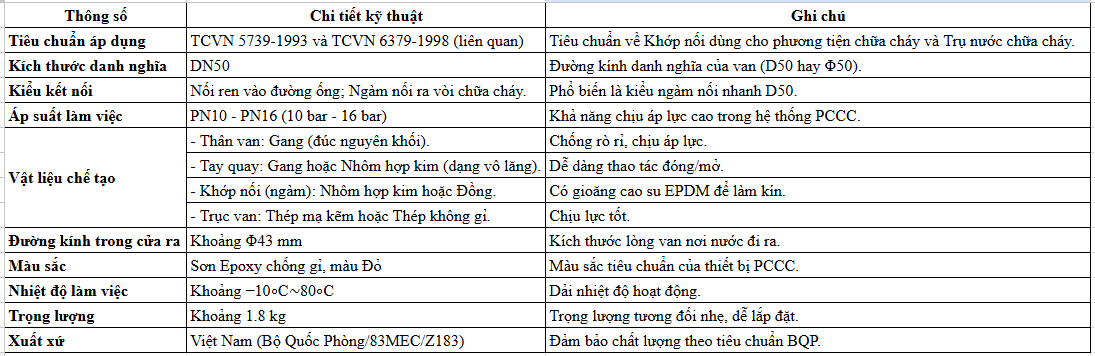 Thông Số Kỹ Thuật Của Van Góc Cứu Hỏa D50 Bộ Quốc Phòng