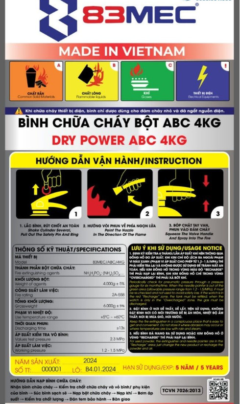 - Bình cứu hoả bột ABC 4 kg 83MEC BQP do Việt Nam sản xuất đạt chất lượng cao và đã qua kiểm định chất lượng là một sản phẩm an toàn và tin cậy trong công tác phòng cháy chữa cháy. Với sự tự hào là sản phẩm của Việt Nam, bình cứu hoả này được thiết kế và sản xuất theo các tiêu chuẩn nghiêm ngặt để đảm bảo hiệu quả cao trong việc dập tắt đám cháy.