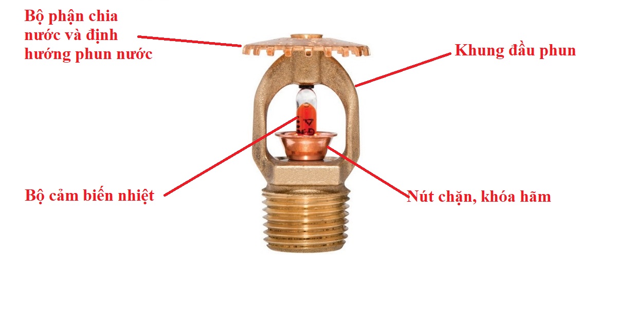 – Bộ cảm ứng nhiệt: Là thành phần kiểm sóat nhiệt độ để phun nước. Ở nhiệt độ bình thường, bộ cảm ứng sẽ chặn giữ nút chặn lại làm kín nước, khi nhiệt độ cao đạt đến ngưỡng họat động bộ cảm ứng sẽ giải phóng làm rơi nút chặn ra.