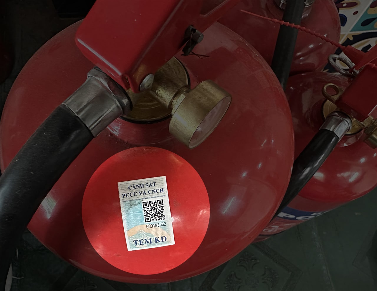 - Quan sát tem kiểm định: Tem elip in sắc nét, thông tin rõ ngày, tháng, năm kiểm định; tem khổ 3×4 cm, nền đỏ (bình bột, bọt) hoặc nền vàng (bình CO₂). Gỡ nhẹ mép tem, lớp hologram chống bóc tách lộ chữ “VOID”.