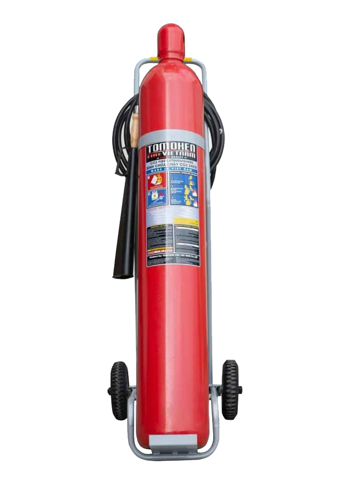 - Bình chữa cháy xe kéo Tomoken 24kg khí CO2 TMK-VJ-CO2/24Kg có dán nhãn màu đen trên thân bình bao gồm thông tin loại bình, thông số kỹ thuật và hướng dẫn sử dụng. Mặc dù lượng khí chữa cháy trong bình chỉ là 24kg nhưng trọng lượng bình lại lên đến 80kg là do phần vỏ bình làm bằng lớp thép dày chống áp lực cao để có thể chịu được áp suất từ khí nén CO2 dùng để chữa cháy