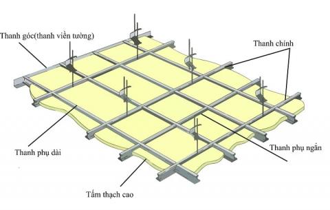 Trần thạch cao có cấu tạo với các phần như: khung xương thạch cao, tấm thạch cao, sơm bả và vật tư phụ liên quan. Trong đó: