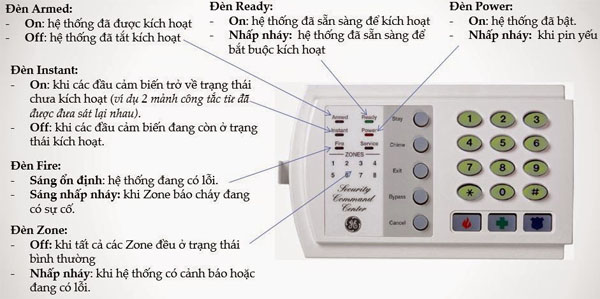 – Báo động bằng còi hú 120dB và báo bằng tín hiệu đèn, tiếng kêu trên bàn phím điều khiển.